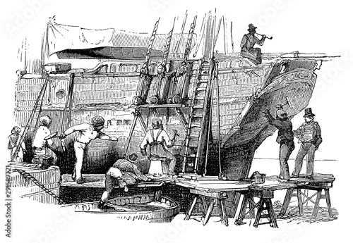 Obraz premium Caulkers working in the process of sealing a wooden boat watertight inserting fibers of hemp or cotton soaked in pine tar between planks with a caulking mallet