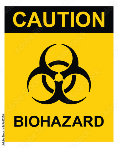 Obraz premium Caution biohazard, black and yellow sign. Caution sign with biohazard symbol and text, vector illustration