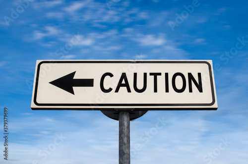 © Maria Vonotna, Fototapeta premium Caution road sign, arrow on blue sky background. One way blank road sign with copy space. Arrow on a pole pointing in one direction.