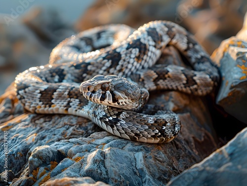 © Thares2020, Obraz premium Cautious Snake Coiled in Defensive Spiral on Rocky Outcrop