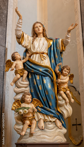 © Renáta Sedmáková, Naklejka premium CAVA DE TIRRENI, ITALY - OCTOBER 7, 2025: The carved polychrome statue of Assumption in the church Chiesa di San Francesco probably by unknown artist.