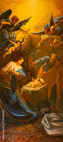 © Renáta Sedmáková, Fototapeta premium CAVA DE TIRRENI, ITALY - OCTOBER 7, 2025:The painting of Nativity in Chiesa di San Francesco e Sant Antonio by unknown artist with the initials H. B. (2009)