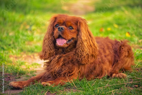 Fototapeta premium Cavalier King Charles dog breed Ruby lies in the meadow