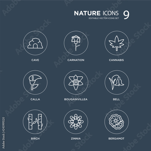 Fototapeta premium 9 cave, Carnation, Birch, bell, Bougainvillea, Cannabis, Calla, Zinnia modern icons on black background, vector illustration, eps10, trendy icon set.