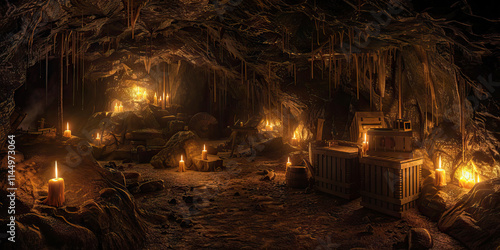 © Lila Patel, Obraz premium Cave Interior with Candles and Wooden Crates
