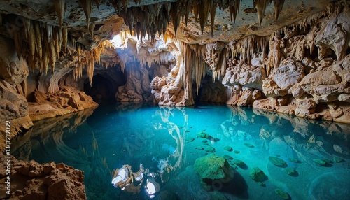 Fototapeta premium Cave interior with turquoise water and stalactites