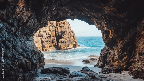 © Raffaza, Fototapeta premium Cave opening on beach with turquoise waves.