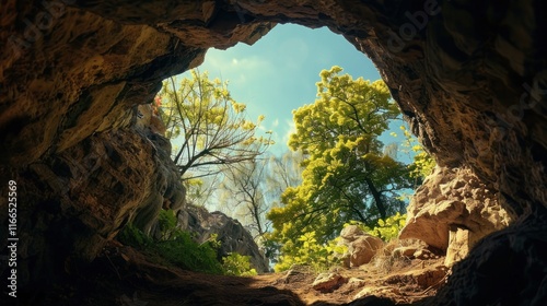 © Mbk, Obraz premium Cave opening revealing sunlit forest.