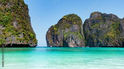 Obraz premium Ccenic view of pure blue sea, boats and distant mountains, Phuket and Phi Phi...