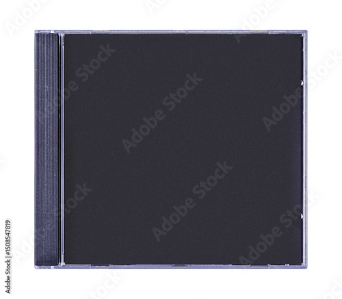 © Print, Fototapeta premium CD disk video case on black background. Isolated music transparent mockup. Clean cover box template.