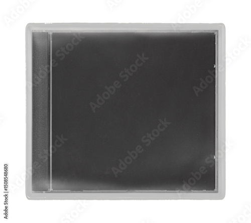 © Print, Fototapeta premium CD disk video case on black background. Isolated music transparent mockup. Clean cover box template.