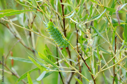 © Bob, Naklejka premium Cecropia Moth Caterpillar in the 3rd instar stage on a willow bush in Ontario, Canada.