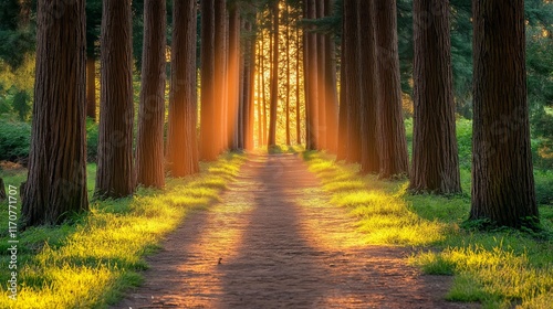 © mirifadapt, Obraz premium Cedarwood Forest at Twilight: A cedarwood forest at twilight, with tall trees casting long shadows