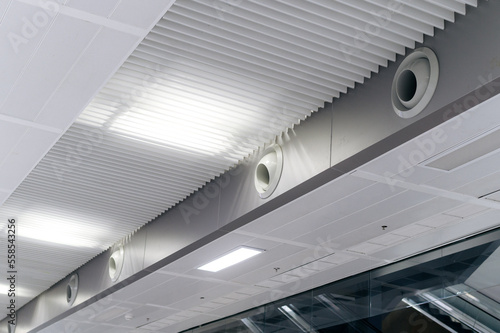 © Jirawatfoto, Obraz premium Ceiling mounted cassette type air conditioner and modern lamp light on white ceiling. duct air conditioner for home or office
