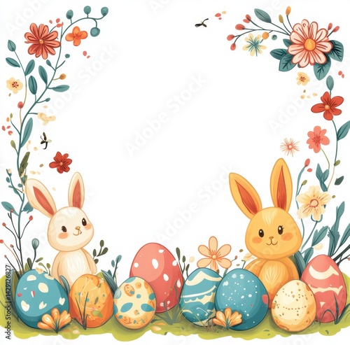 Obraz premium Celebrate Easter with a colorful frame of baby bunnies, flowers, and decorated eggs in charming doodle art style
