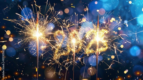 © aishale, Obraz premium Celebrate 2025 with Sparkling Fireworks: Colorful Illuminations Against a Deep Blue Background Featuring 'New Year' Text