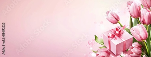 © DreamPointArt, Naklejka premium Celebrate Women's Day with vibrant tulips and a gift box in a soft pink setting, perfect for personal messages and acknowledgments