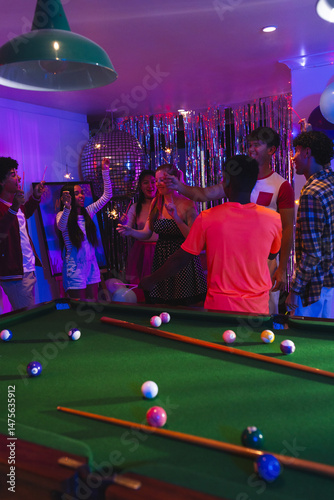 Fototapeta premium Celebrating around pool table, teenagers with drinks in festive party atmosphere