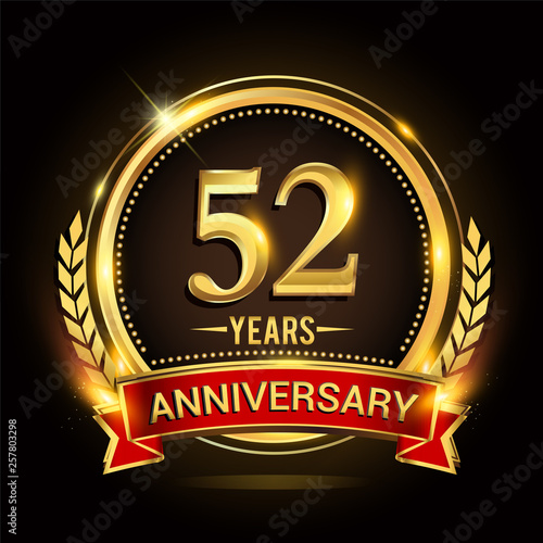 © Vectorideas, Fototapeta premium Celebrating 52nd years anniversary logo with golden ring and red ribbon.