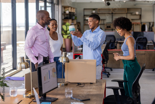 © wavebreak3, Obraz premium Celebrating teamwork with gift, African American colleagues smiling in office