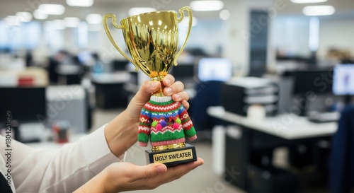 © Ophelia, Obraz premium Celebrating ugly sweater day with a trophy in the office for a fun holiday gathering