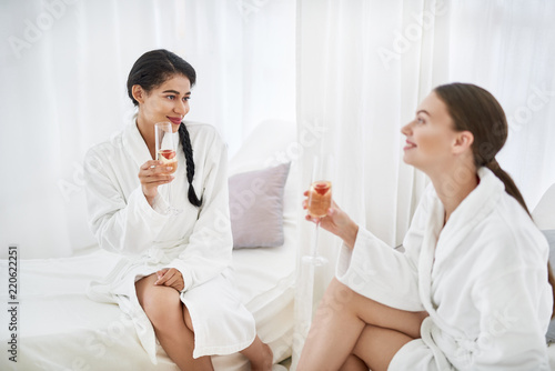 Fototapeta premium Celebrating with you. Cheerful young ladies in bathrobes holding glasses of...