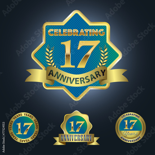 © SunnySideUp, Naklejka premium Celebrating 17 Years Anniversary - Blue seal with golden ribbon