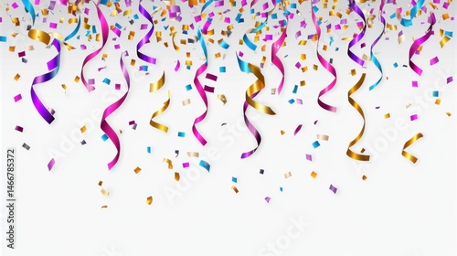 Fototapeta premium Celebration background of falling confetti and ribbons on white surface...