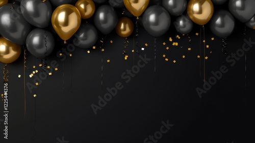 © ChiffonCake, Naklejka premium Celebration balloons black background party decor elegant atmosphere close-up festive vibe