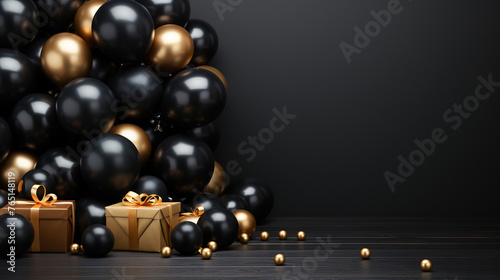 © MUKTAA, Naklejka premium Celebration black friday copy space background with black and golden presents and balloons