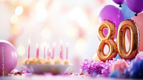 Fototapeta premium Celebration of a joyful 80th birthday with vibrant decorations and cake