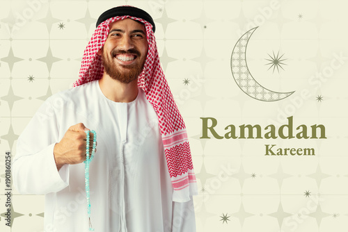 Fototapeta premium Celebration of Ramadan with a smiling man holding prayer beads