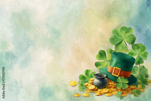 Naklejka premium Celebration of St. Patrick's Day with a green hat, pot of gold, and clovers on a soft background