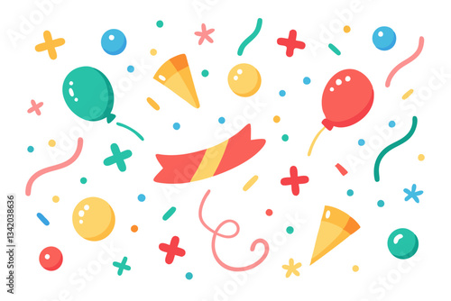 Fototapeta premium Celebration Pattern Background with Balloons, Confetti, Ribbons, Party Hats, and Stars on White Background