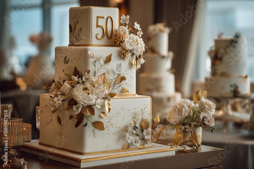 © Oleg, Fototapeta premium Celebration with a large cake featuring flowers for a 50th anniversary event in a decorated venue