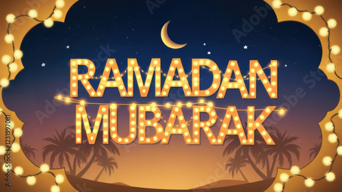 © Shozib, Fototapeta premium Celebratory Ramadan Mubarak display illuminated with warm lights and crescent moon at dusk