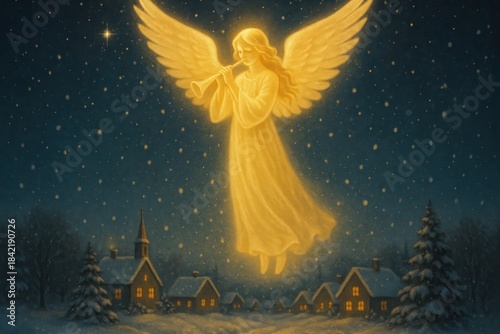 © Rawpixel.com, Naklejka premium Celestial angel over snowy village.