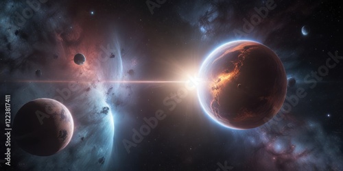 Obraz premium Celestial bodies orbiting a shimmering nebula, universe, space