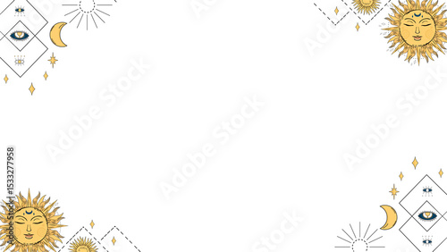 Fototapeta premium Celestial border is showcasing sun faces, moons, stars and eye motifs on...