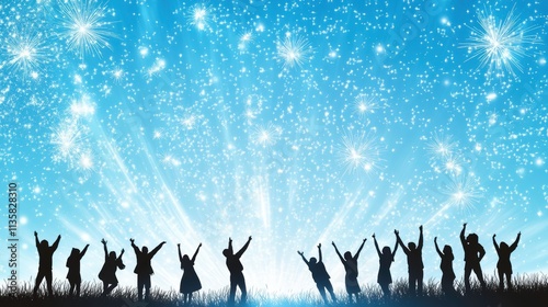 Obraz premium Celestial Celebration: Silhouettes of joyous people against a vibrant...