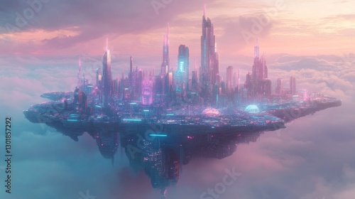 Naklejka premium Celestial Cityscape: A Futuristic Metropolis Floating Above the Clouds at Sunset
