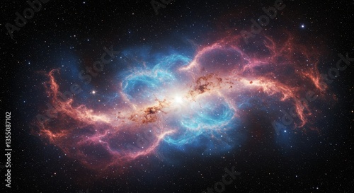 Fototapeta premium Celestial Collision: A Cosmic Dance of Light and Color - A vibrant nebula, showcasing a collision of cosmic matter, explodes with swirling blues and reds against a dark space backdrop