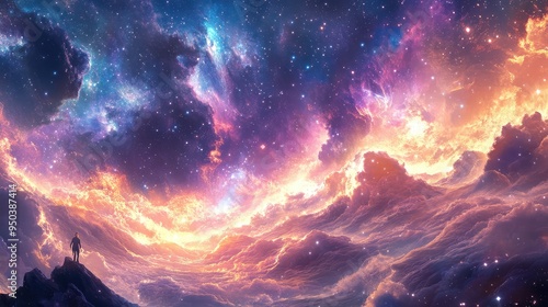 © Timeless Touch, Fototapeta premium Celestial Echoes: Ethereal cosmic waves and glowing star fields creating a dreamy, celestial landscape.