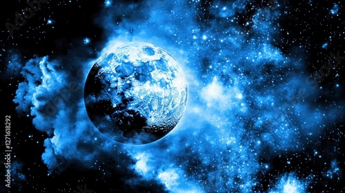 © Afriza bayu, Obraz premium Celestial Enigma: A Blue Planet's Cosmic Dance