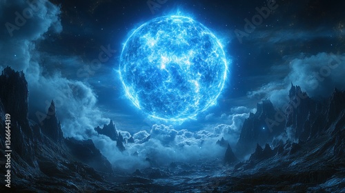© abdul kahfi, Fototapeta premium Celestial Enigma: A Glowing Blue Orb Dominates a Mystical, Dark Landscape