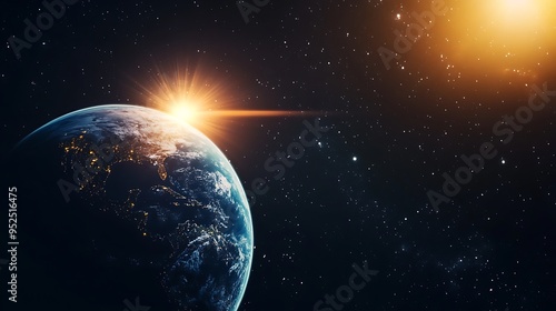 © Thavesak, Obraz premium Celestial Glow: Earth Surrounded by Sun Rays in Space