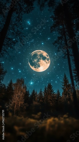 © PremiumPhoto, Fototapeta premium Celestial Glow. Space id Forest bathing Cosmos Crypto Esg fintech Sound bath Amazon Simple Notification Service Moonpay Lumen5 Solana Munch ai Full moon shining bright over pine night sky