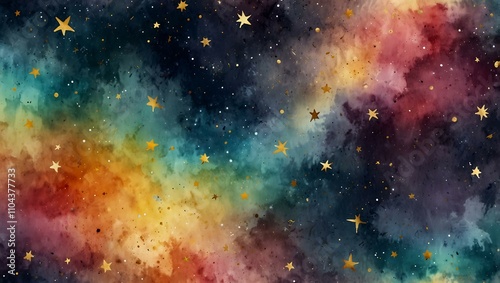 Naklejka premium Celestial gradient watercolor background with golden stars.