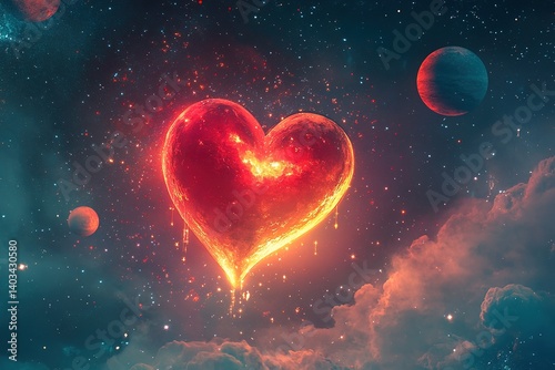 © Rayhanbp, Obraz premium Celestial Heart: Glowing Heart in Cosmic Sky among Planets and Starry Sky