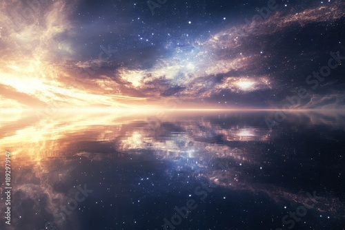 © YouraPechkin, Fototapeta premium Celestial landscape reflecting starlit sky over calm water at twilight